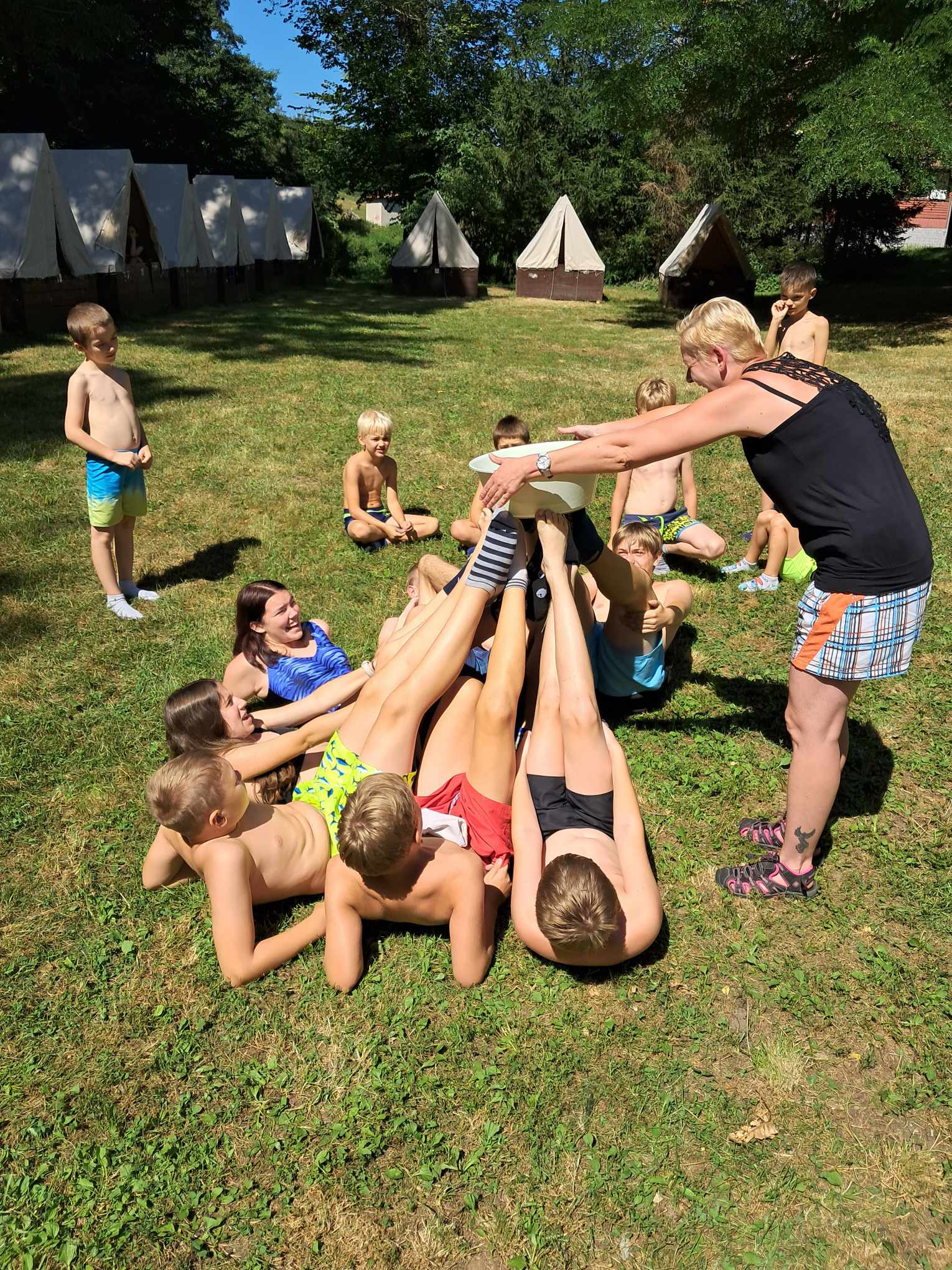 Cílem hry bylo udržet rendlík s vodou nohami, tak aby nespadnul. Ale to by bylo pro nás jednoduché a tak jsme si museli ještě při tom postupně sundávat ponožky. No nebudeme vás napínat, nepovedlo se, ale aspoň příjemné osvěžení.